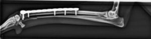 イタリアングレーハウンドのような細い四肢をもつ犬種では、骨折後のずれ(転位)や再骨折のリスクが高く、しっかりと安定させる固定が重要になります。今回は、チタン製のロッキングプレートシステムを用いて骨を正確な位置に戻し、強固に固定しました。
